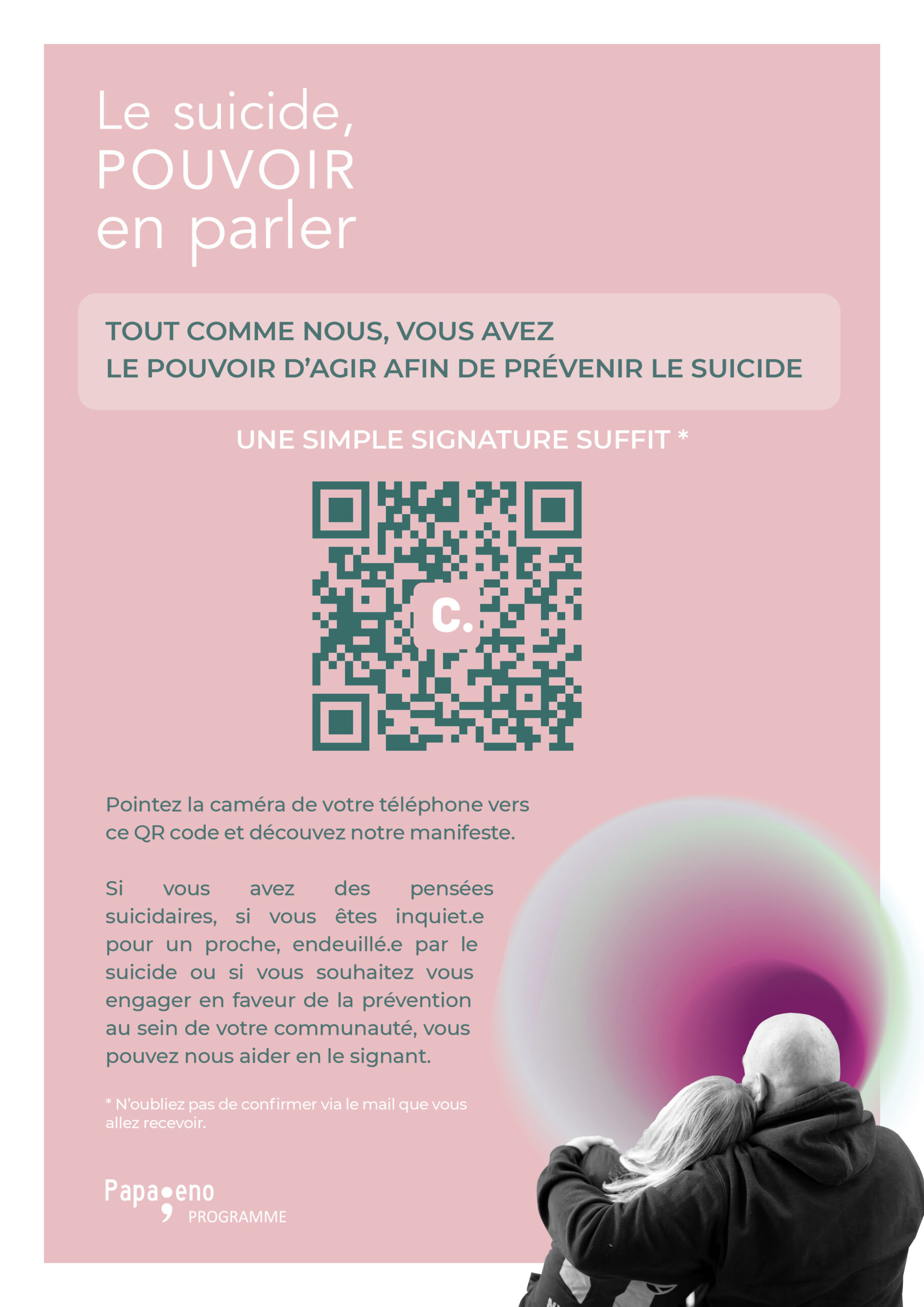 Si comme moi, vous souhaitez lever le voile sur le suicide et sa prévention, je vous invite à signer le manifeste (https://www.change.org/ParleMoiDeTonSilence). Ainsi qu’à envisager cette possibilité de relai public ; des outils de communication ont été spécialement conçus pour vous y aider (https://papageno-suicide.com/ressource/parle-moi-de-ton-silence/).
