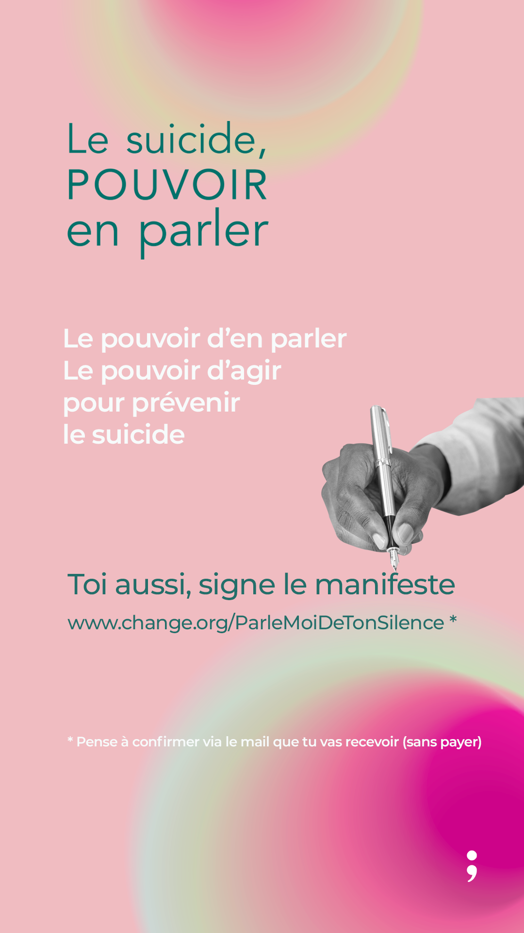 Voici le nouveau projet du programme Papageno. Un programme de prévention qui sauve des vies. Si ça te touche, c’est que c’est le moment pour toi de signer. Tout comme je l’ai fait. Vérifie bien ta boite mail car il faut confirmer (aucun paiement n’est requis). https://www.change.org/ParleMoiDeTonSilence.
